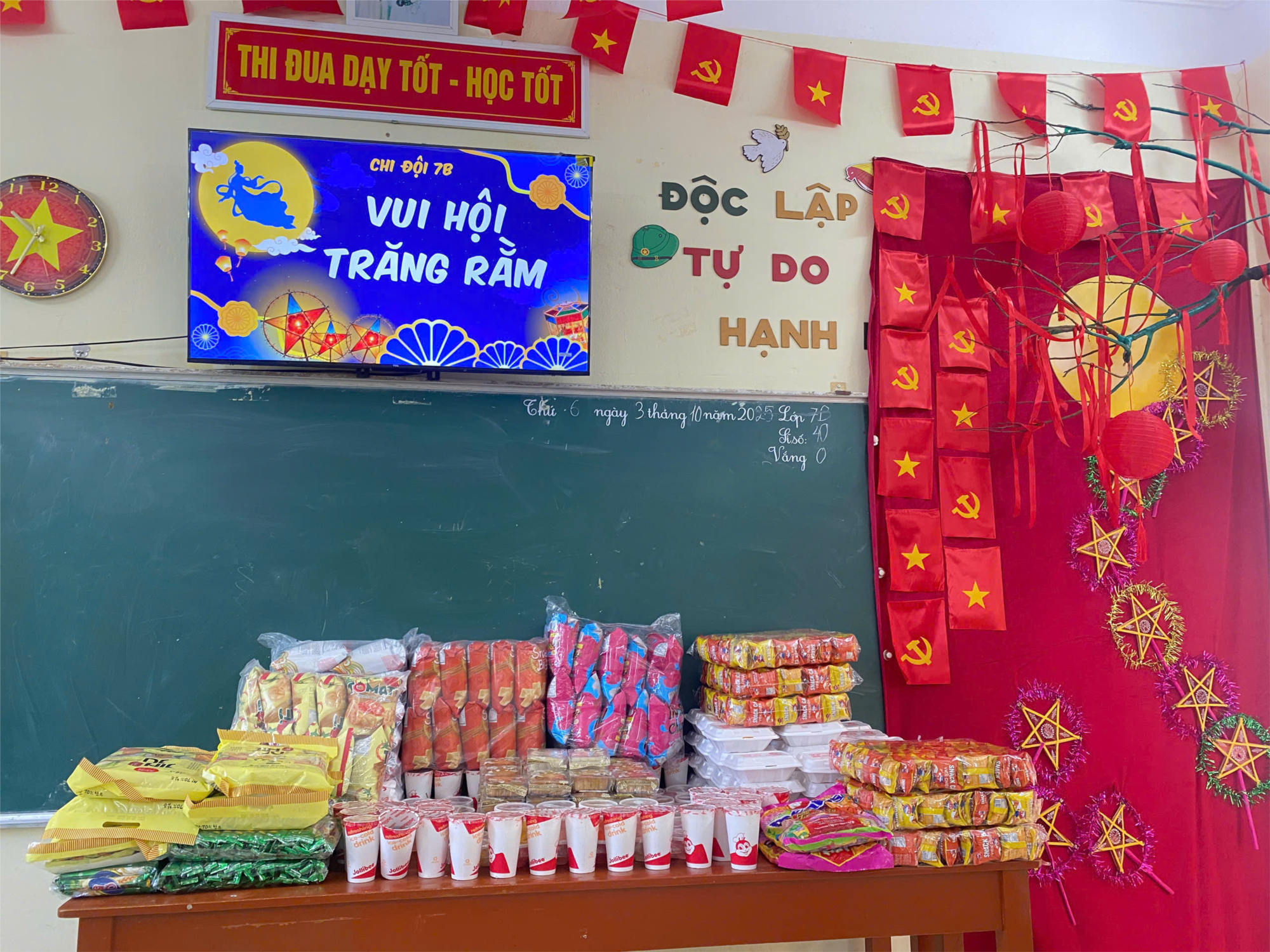 Từ sớm, lớp học đã rộn ràng tiếng cười nói, những bàn tay khéo léo cùng nhau trang trí mâm cỗ trung thu với đủ sắc màu của đèn lồng, bánh nướng, bánh dẻo và trái cây tươi ngon. Ánh mắt học trò ánh lên niềm vui hồn nhiên, còn nụ cười của cô giáo như hòa vào niềm hạnh phúc chung, khiến không gian lớp học bừng sáng như có trăng rằm ghé thăm 🌝✨.