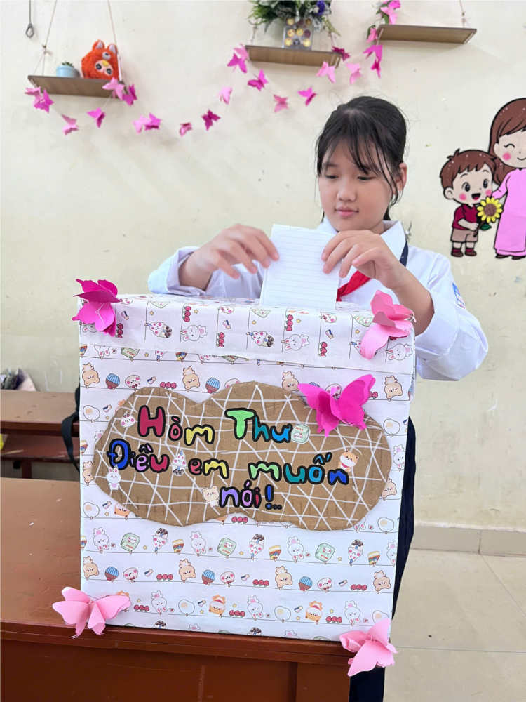 Lớp 6B xây dựng Hộp thư “Điều em muốn nói” nhằm tạo không gian để mỗi học sinh chia sẻ những suy nghĩ, cảm xúc và mong muốn của mình. Đây là nơi các em có thể bày tỏ niềm vui, nỗi buồn hay những điều còn băn khoăn một cách chân thành và an toàn. Mọi ý kiến đều được tôn trọng, giữ kín và lắng nghe nghiêm túc. Thông qua hộp thư, thầy cô sẽ hiểu học sinh hơn để kịp thời quan tâm, giúp đỡ. Qua đó, lớp 6B cùng nhau xây dựng một tập thể đoàn kết, yêu thương và thấu hiểu.